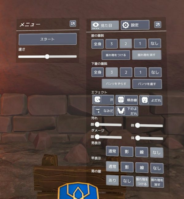 エッチシーンのスタートとピストン速度の変更、体位の変更といったエリアと、僧侶と男の見た目変更が可能なエリアがあり、衣装の脱衣や顔の汗、赤面、汚れなども変更可能です。